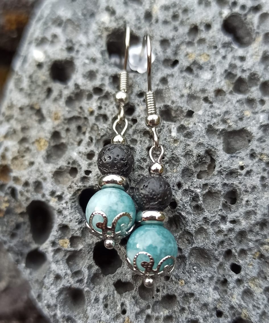 Brincos feitos à mão, com a arte e a beleza natural das pedras que os compõem. À textura e força da pedra vulcânica basalto, associa-se o bonito azul da pedra Água Marinha, pedra da serenidade.