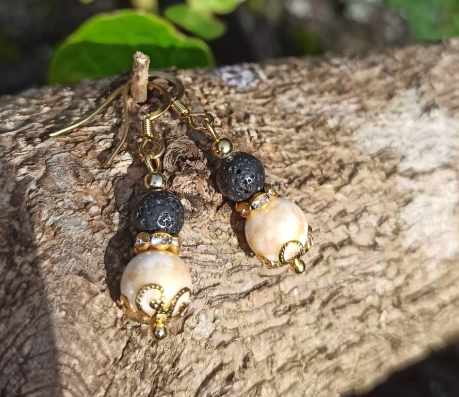 Brincos feitos à mão, com a arte e a beleza natural das pedras que os compõem. À textura e força da pedra vulcânica basalto, associa-se o bonita howlita branca com detalhes dourados.