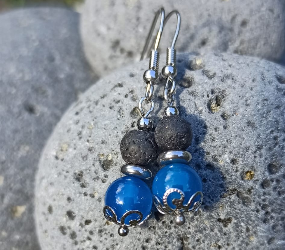 Brincos feitos à mão, com a arte e a beleza natural das pedras que os compõem. À textura e força da pedra vulcânica basalto, associa-se o azul da pedra ágata, que nos remonta para o mar.